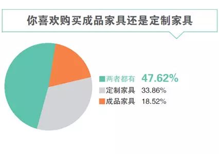 定制家具占比為33.86%,這與家具展上定制一頭獨(dú)大的場面有些出入,但并不意味著成品家具又將迎來春天,而是新中產(chǎn)在選購家具時更為審慎,47.62%表示將根據(jù)不同類型家具特點(diǎn)搭配成品家具和定制家具,考慮到定制意味著更高費(fèi)用和更長時間,有選擇性定制不失為明智之舉。