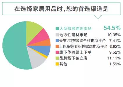 這群愿意自主選購家居用品的消費(fèi)者,在選購時更青睞于何種渠道?調(diào)查顯示,大型連鎖家居賣場將是這個群體的主要去處,54.5%的受訪者表示將其列為自己選購家居用品的首選渠道;地方性建材市場、天貓及京東等綜合性電商平臺、土巴兔等專業(yè)家居電商平臺、線下體驗線上下單、品牌線下獨(dú)立店等方式都占比在10%上下,平分秋色。